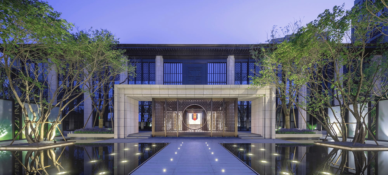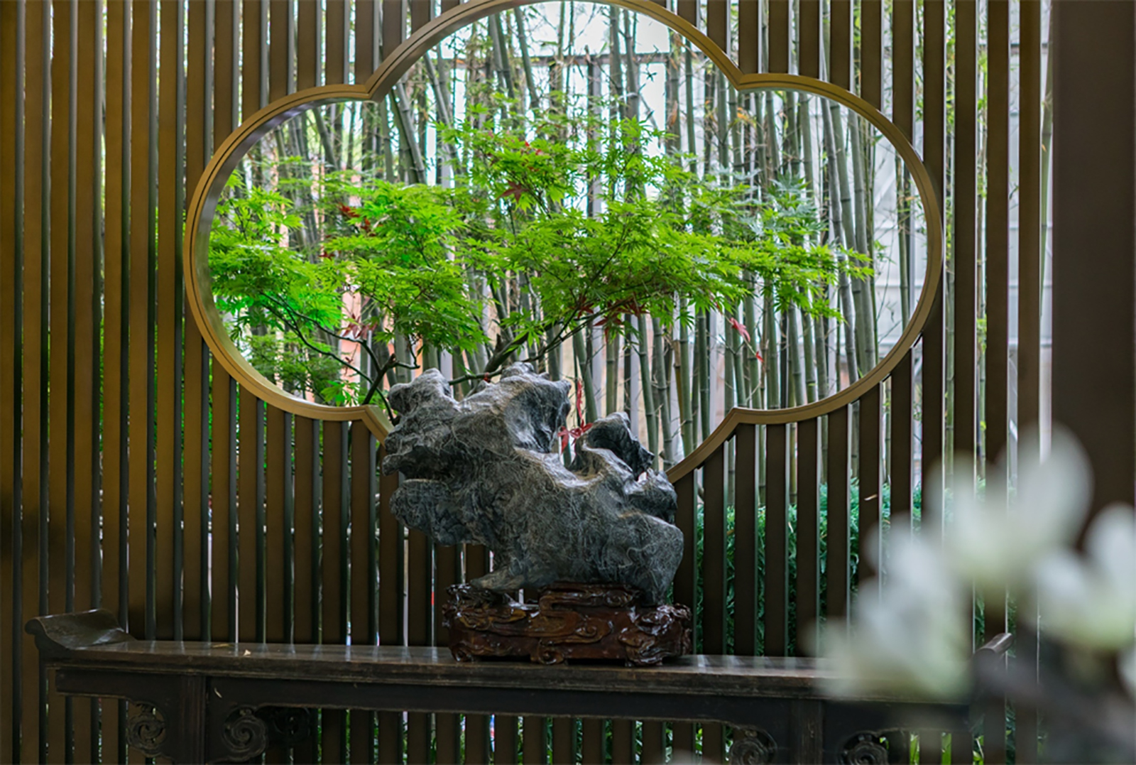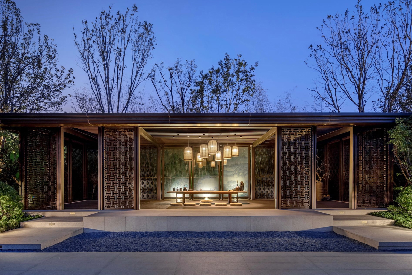 格柵與鏡面水景、絹畫屏風以朝夕光影,輝映秀美瀟湘河山,居者尊享禮儀、景致優雅靜謐、從容唯美。