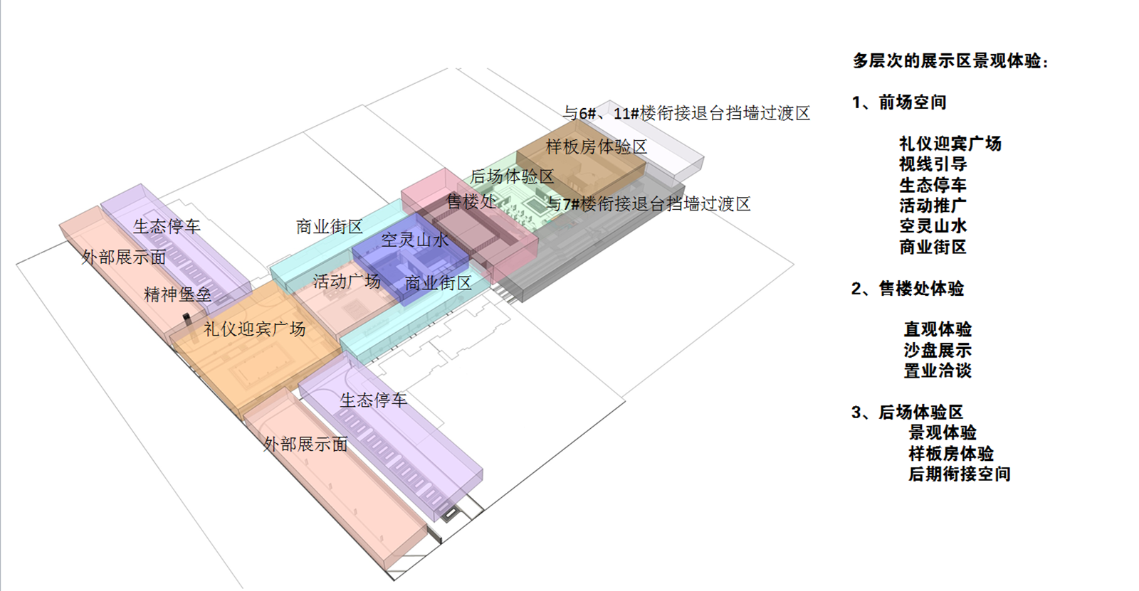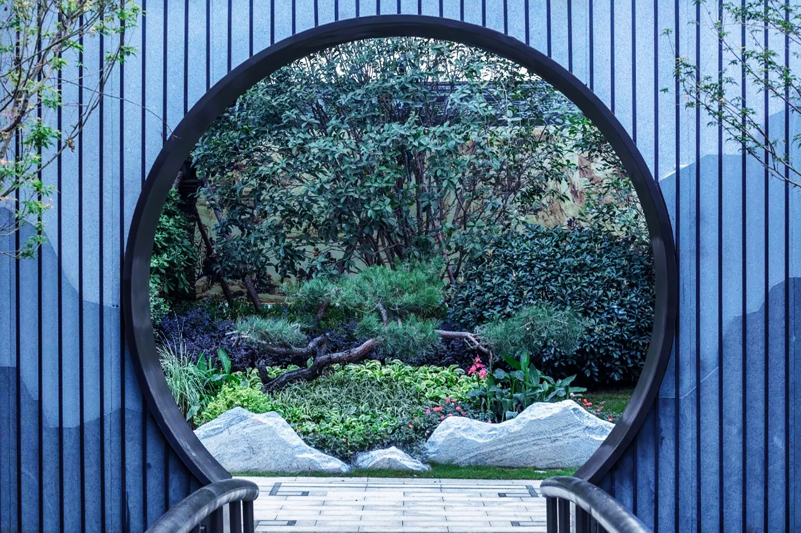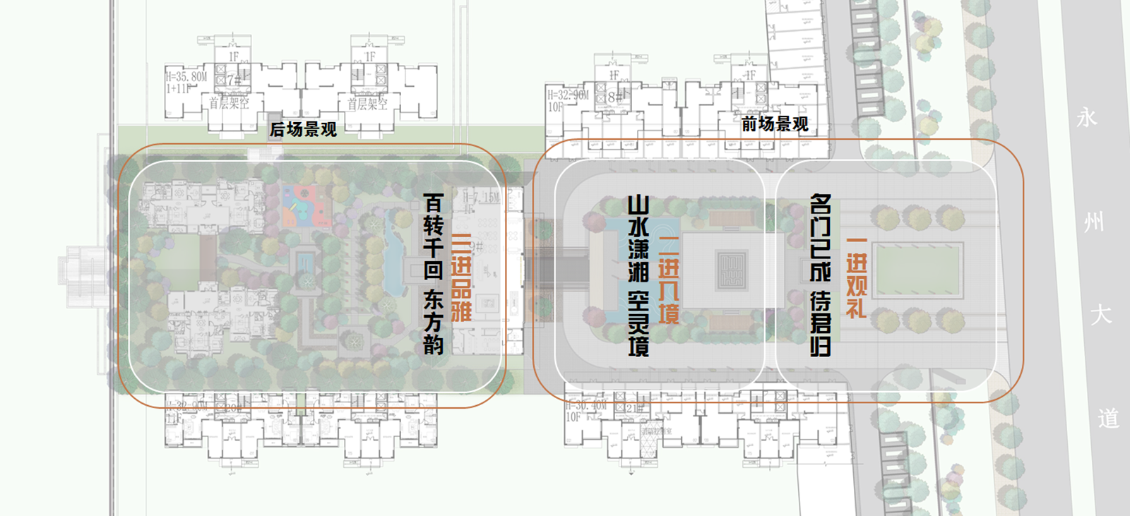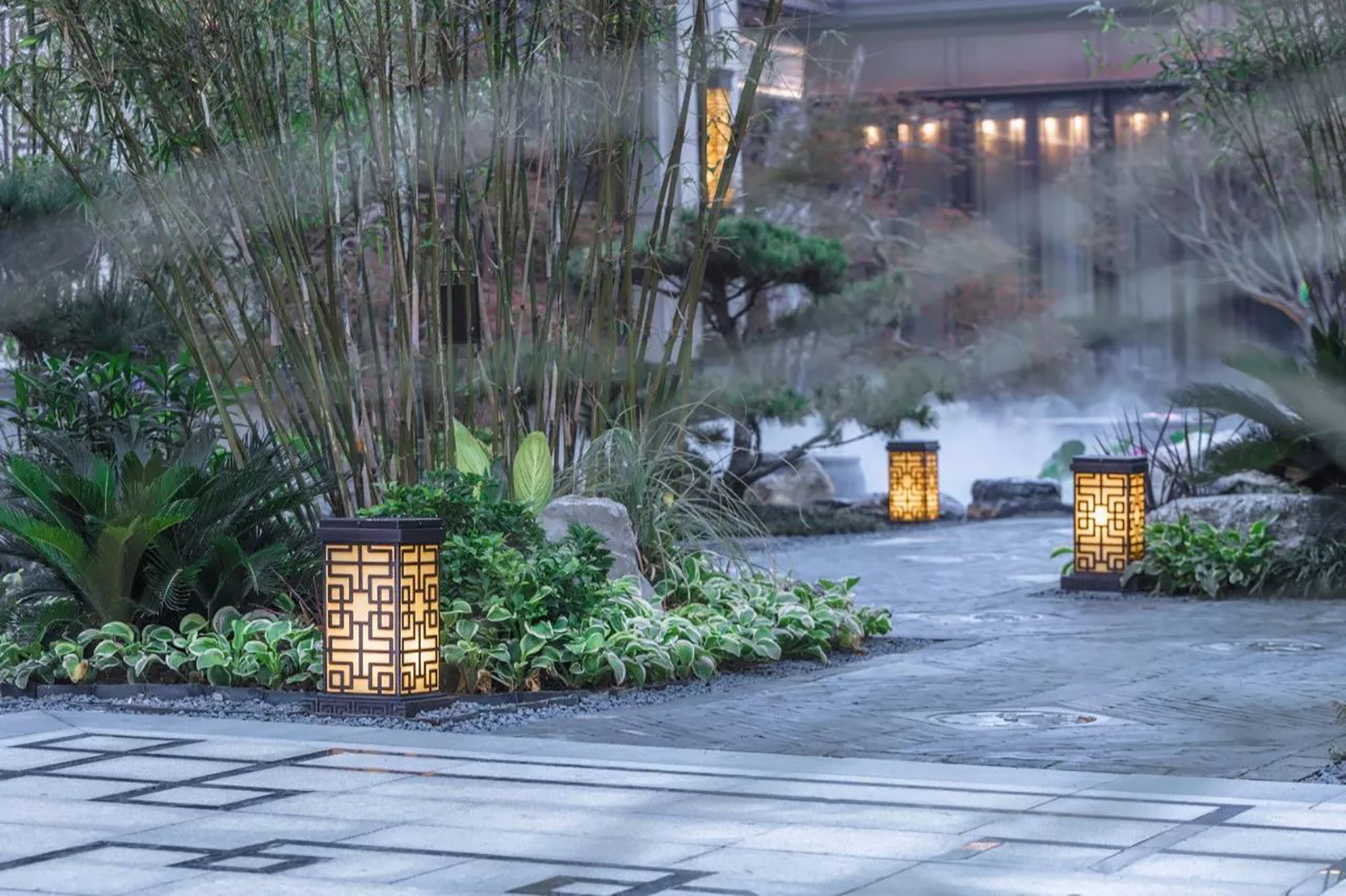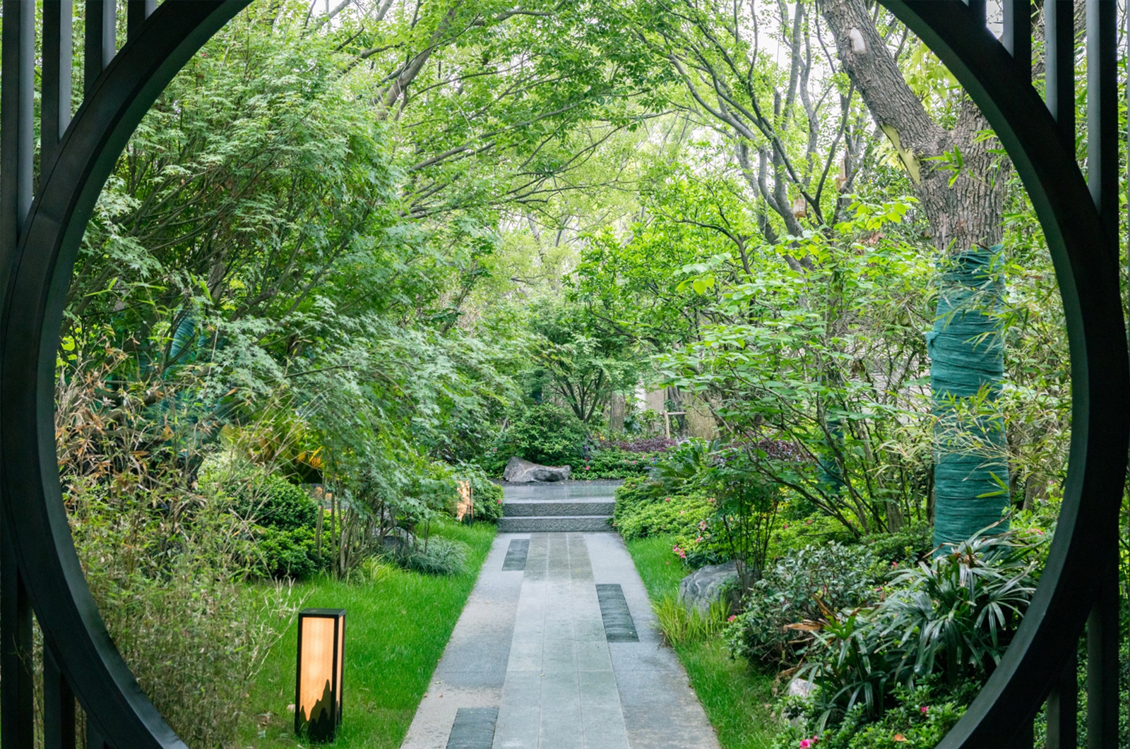 整個展示區景觀采用三進禮敘,一進精制禮儀,禮儀迎賓,二進后場景觀迂回式設計,百轉千回之后,一席東方府邸從容呈現,三進無邊際泳池水景展開,空靈靜美,引導業主進入具有濃郁東方韻味的山水之境。