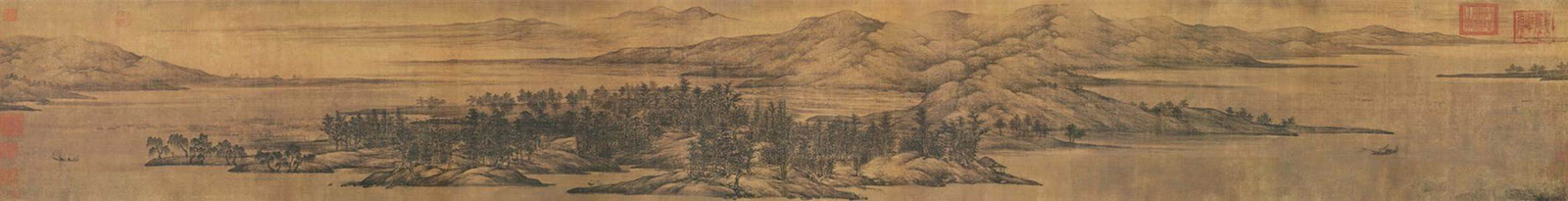 湖光山色,山勢連綿,平遠的構圖方式和近景中大片水域的結合,讓畫面有很強的空間感,更呈現出江南山水的空靈、迷蒙。山水之中又有人物漁舟其間,賦色鮮明,趣味橫生,為寂靜幽深的山林增添了無限生機。
