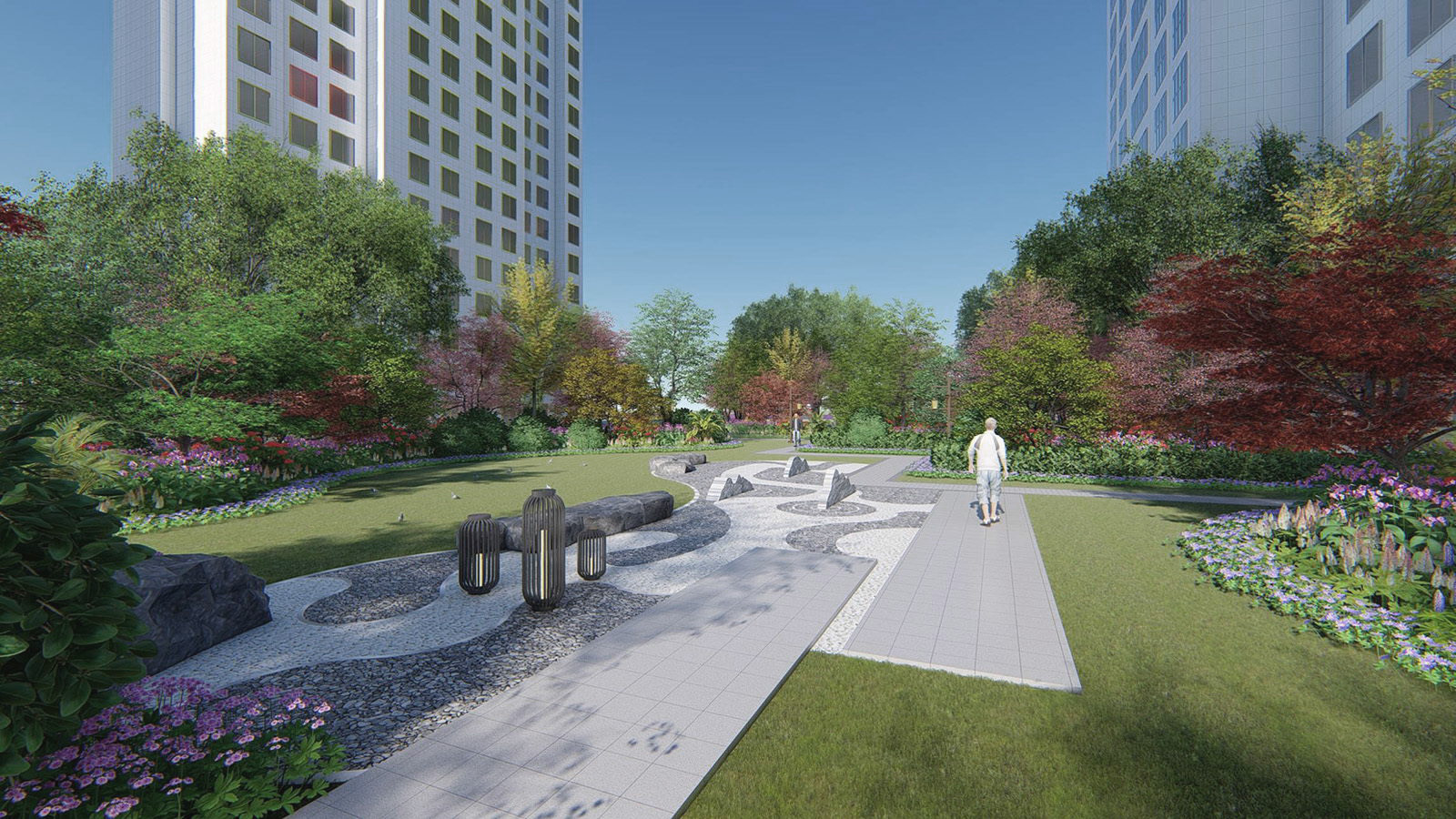以新中式簡約設計手法描繪出完美的幸福社區(qū)生活氛圍,滿足全齡段不同業(yè)主的生活功能需求,依據幸福主題,對不同區(qū)域的組團賦予不同的主題功能,打造三大地塊五大幸福主題花園盛景。