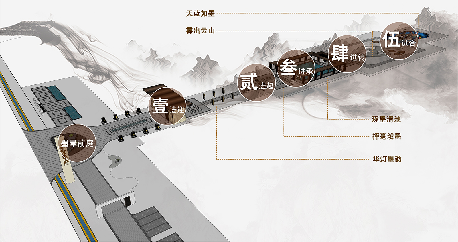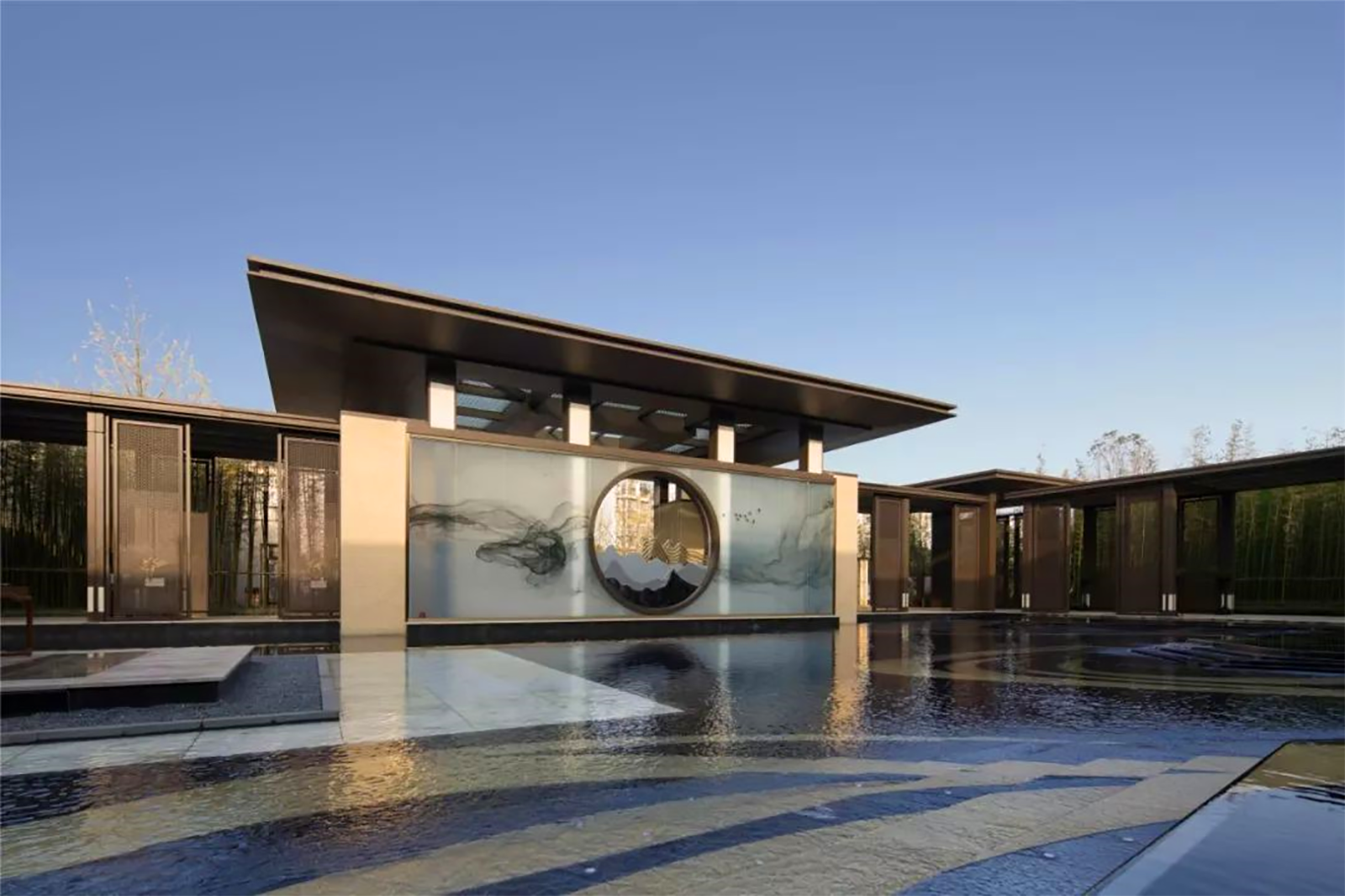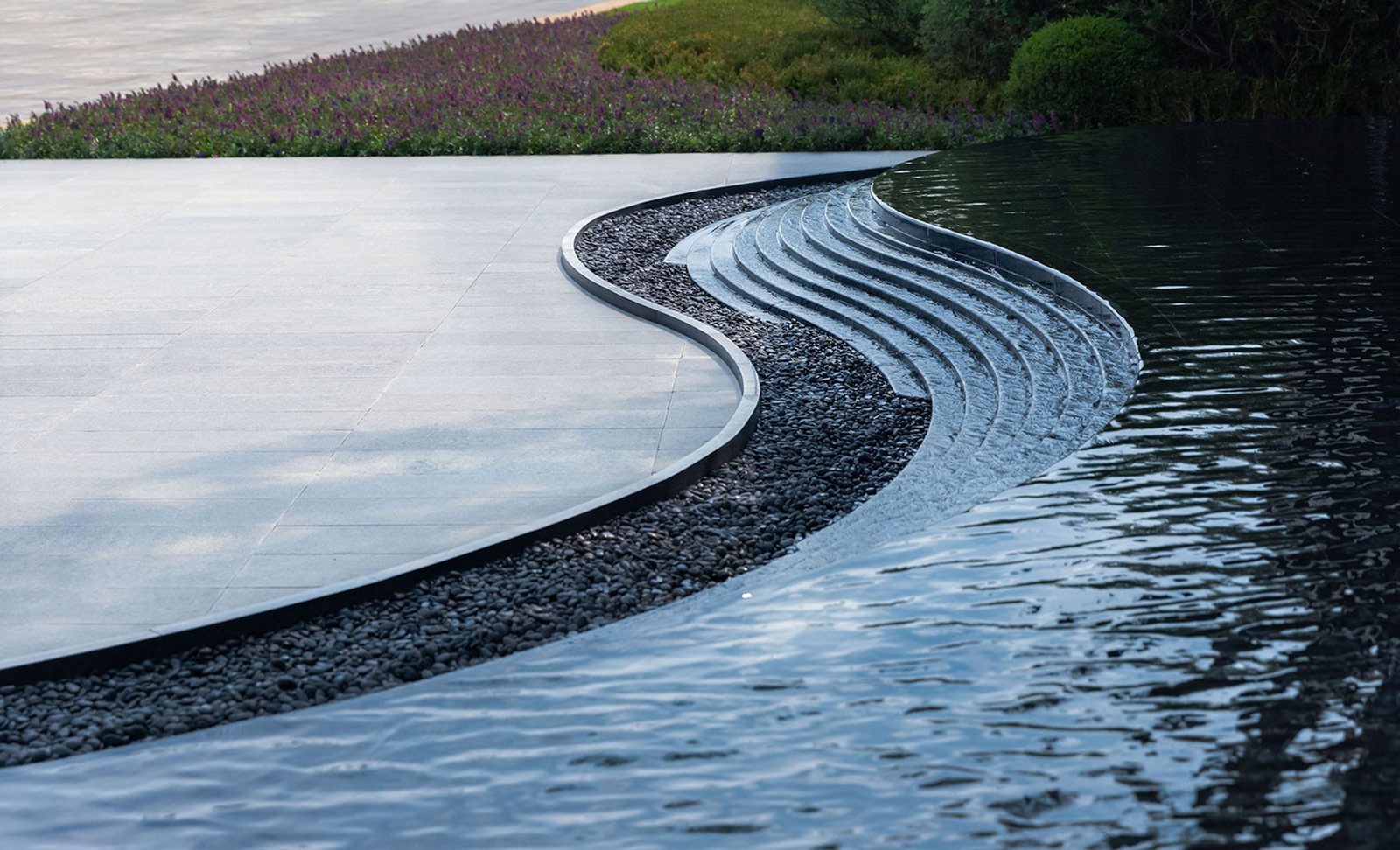 售樓處前場(chǎng)以硯石流墨為視覺(jué)焦點(diǎn),黑色肌理猶如一方硯臺(tái),水景層層疊疊,如水墨輕流,水墨文鋪裝如丹青一抹煙雨濃,墨香氤氳氣韻生,不只是宣紙上走筆才能暈染出水墨的虛幻與自由。