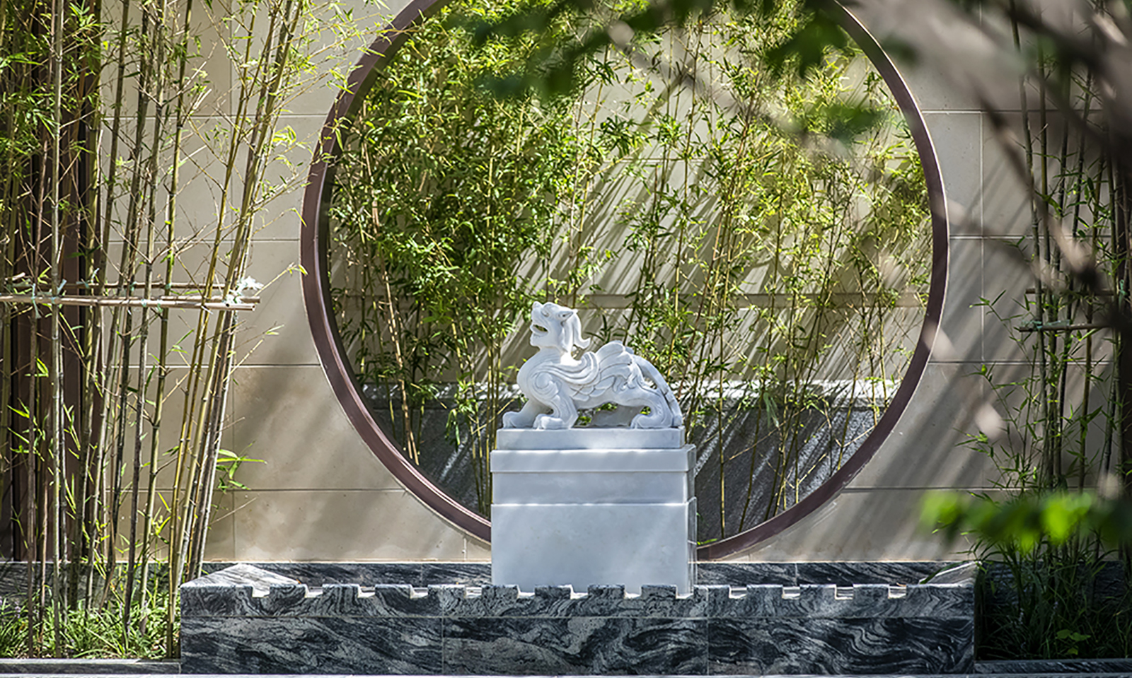 作為一進(jìn)、三進(jìn)之間的起承過(guò)渡空間,整個(gè)空間采用空寂手法,舒朗雅致,對(duì)景景墻,猶如大墨揮毫,筆下千變,雄渾激蕩,勢(shì)如卷席,一副天下風(fēng)云乾坤鋪陳于上,令人胸懷更為寬廣,氣度尤為從容。