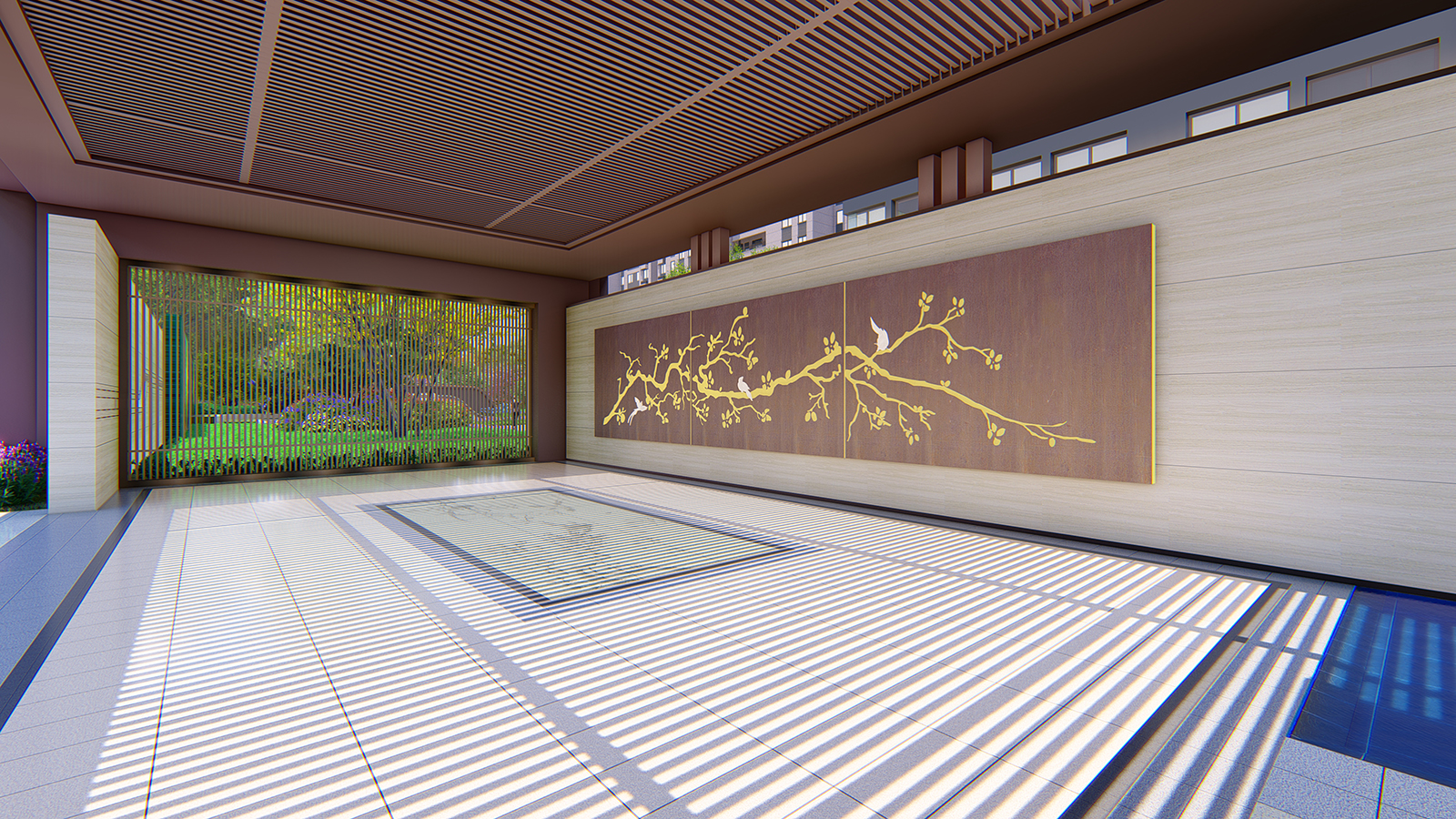 門頭對景處設置“喜上眉(梅)梢”景墻,客戶視線跟隨梅花枝條方向延伸,巧妙構建空間遞進關系,為項目增添趣味及內涵。