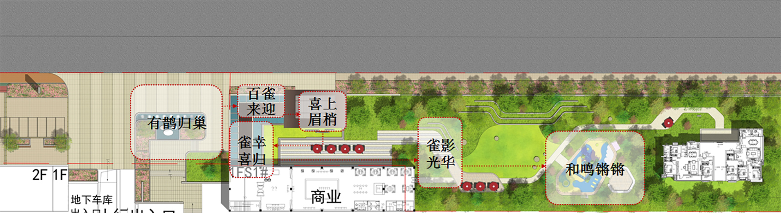 兒童樂園以親子同樂,喜鵲和鳴為意境,設置兒童體驗熱點,同時布置家長休閑看護區與洽談區,園路旁的喬木夾道種植,豐富的綠化層次,都能增強客戶對項目品質更加直觀的感受。