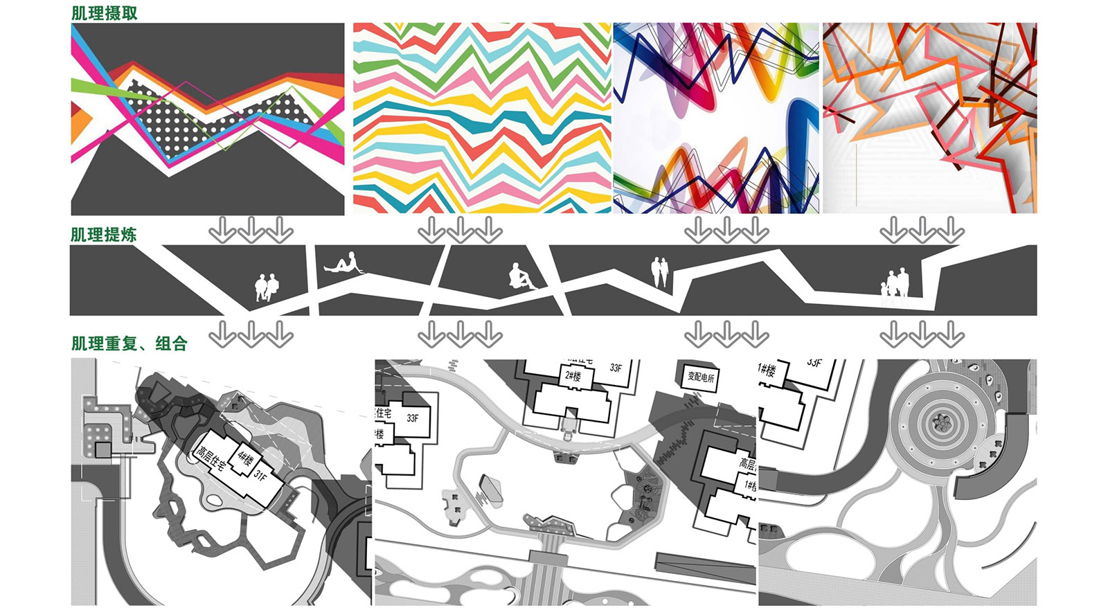 現代、動感、時尚的折線設計肌理重復與組合,強調消除折線的銳角,使景觀更具現代感,更具人性化及安全性能,以一種柔和自然的姿態表現新穎的居住區景觀環境。